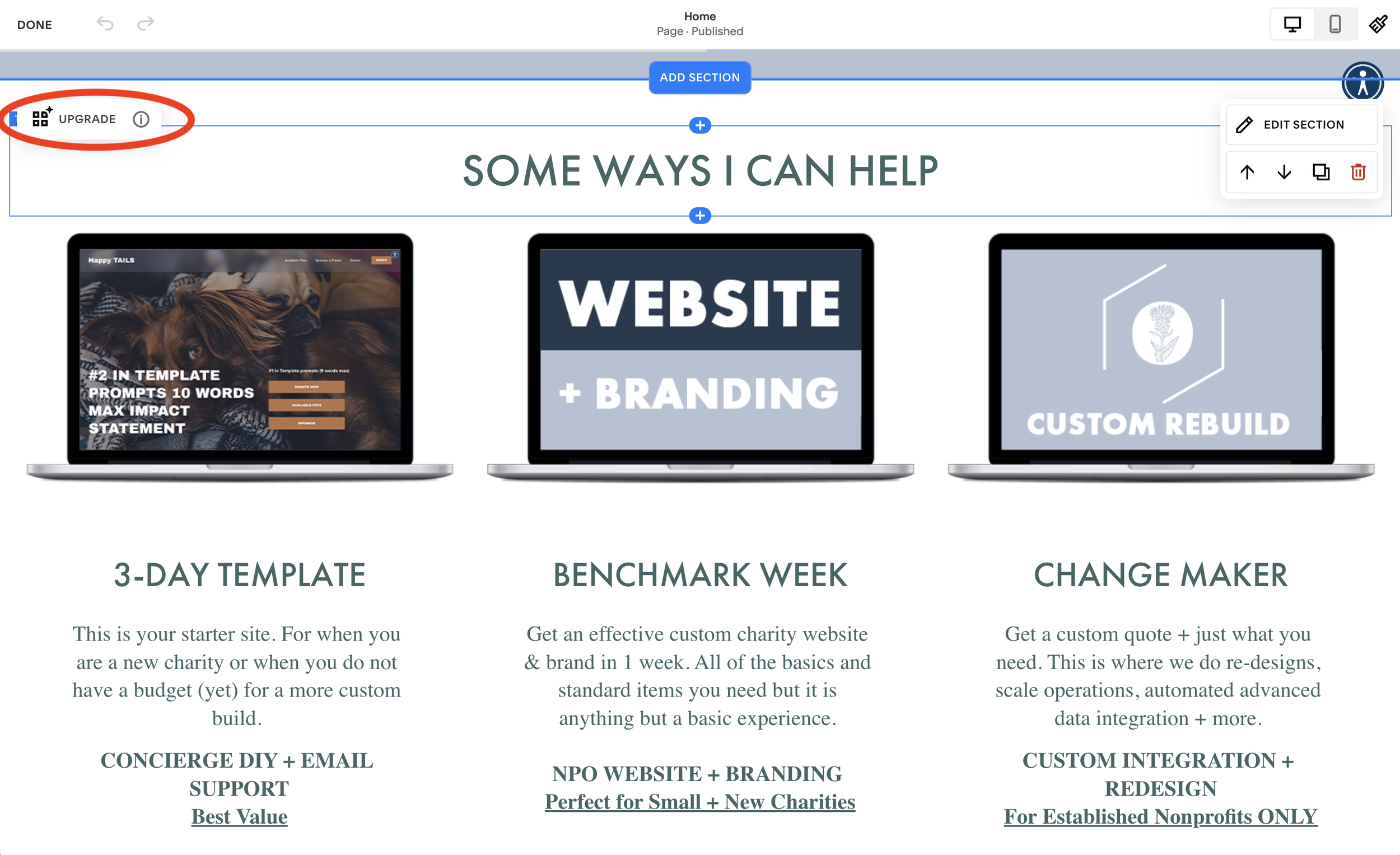 If you see the “upgrade” button on your pages or sections, do not click it at first. Simply duplicate sections and pages to maintain the legacy builder. This will be how I recommend you continue to edit and update your website for the time being until all of glitches are sorted out.